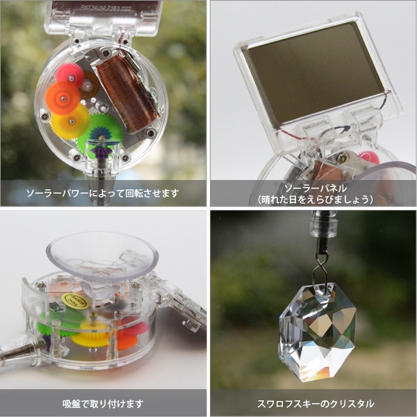 ![]() ソーラーパネルに光が当たるとクリスタルが回転し、 クリスタルに反射した太陽光が虹色の光となって部屋いっぱいに広がります。 取り付けは簡単。吸盤式で窓に取り付けるだけ! ソーラーで動くので電池も電源も必要ありません。 ![]() ![]() ![]() |