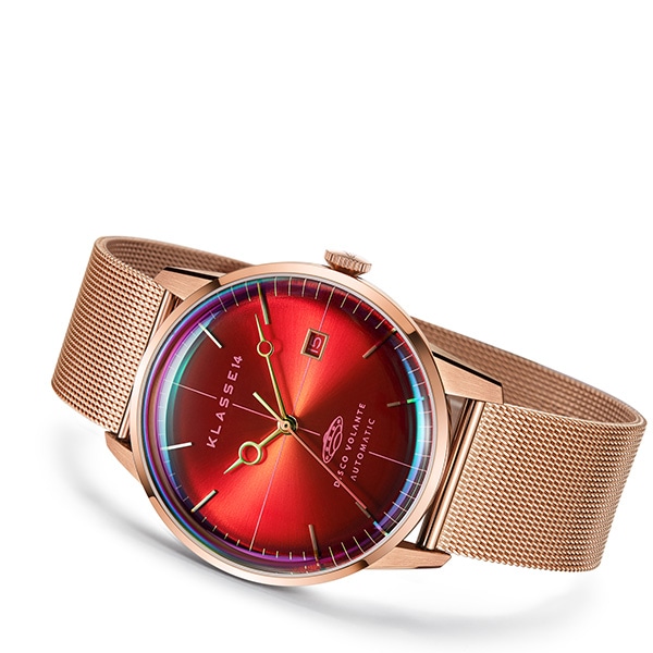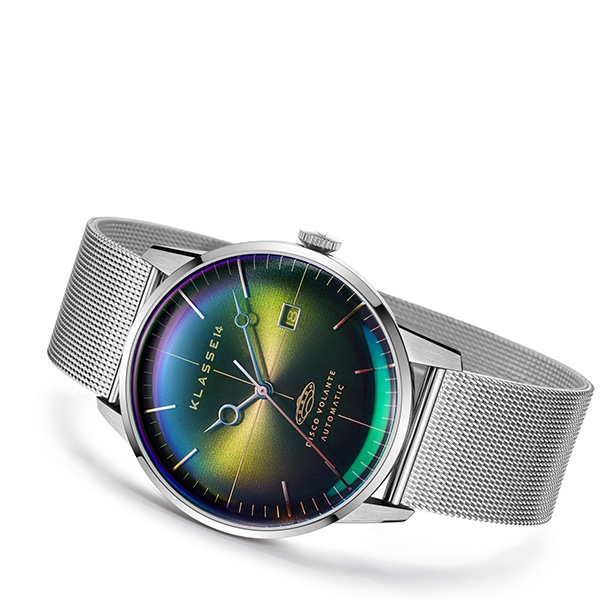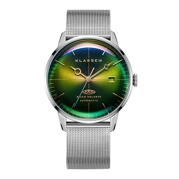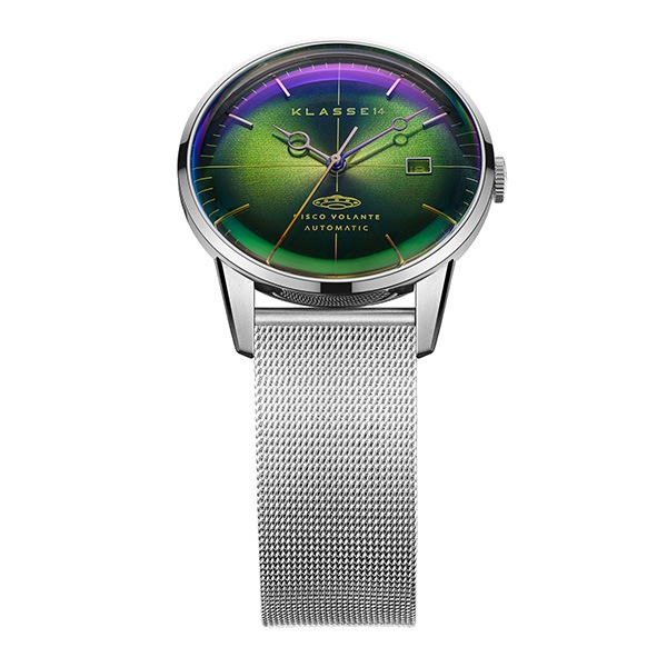 DiscoVolante〈ディスコボランテ〉シリーズから、見る角度で輝きが変わるイリディセントガラスを採用した自動巻きモデルが登場。ミステリアスであり、クレバーなルックスが特徴のKLASSE14の上位モデルです。