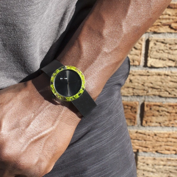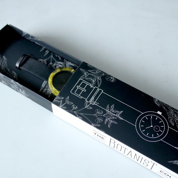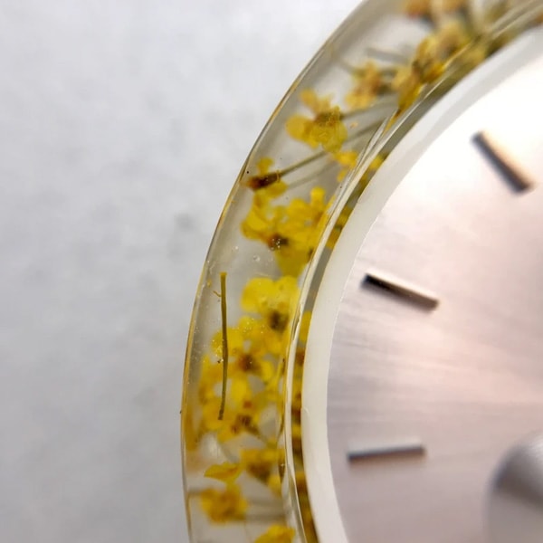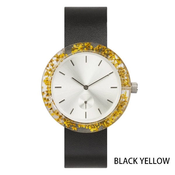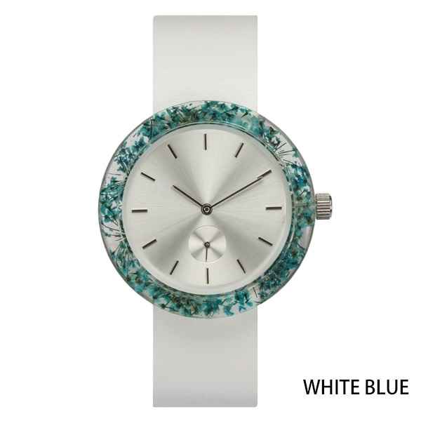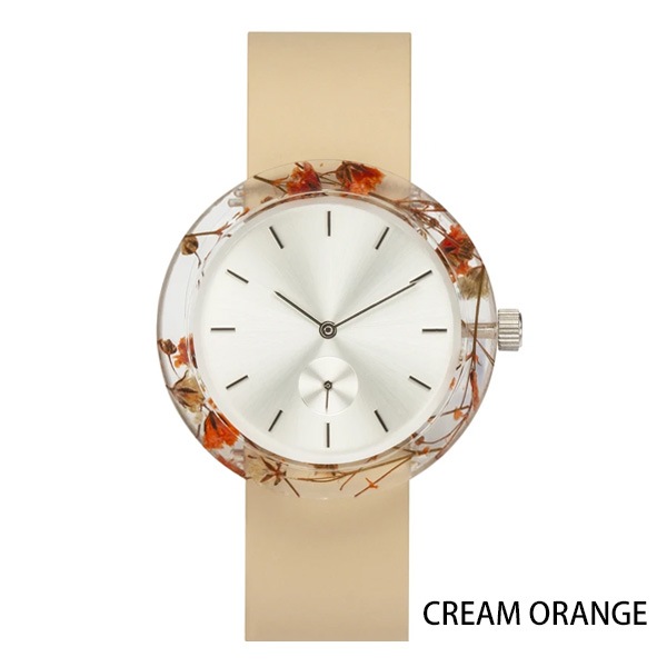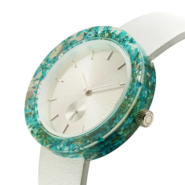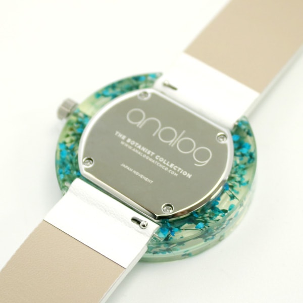透明な樹脂ケースに本物の植物を閉じ込めることにより、身につけた人が都会にいながらも自然を感じることができるという、贅沢な芸術作品を目指して作られた腕時計です。時間をかけてサイズ、樹脂、花など無数の選別を繰り返し作製されました。天然素材の美しさを際立たせるデザインのために、時計にもロゴを使用していません。スタイリッシュで軽量、ケースは約40mm、性別を問わずご愛用いただけます。