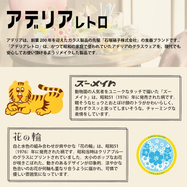 アデリアは、創業 200 年を迎えたガラス製品の先駆「石塚硝子株式会社」の食器ブランドです。「アデリアレトロ」は、かつて昭和の家庭で使われていたアデリアのグラスウェアを、現代でも安心してお使い頂けるようリメイクした製品です。当時の魅力はそのままに、今のライフスタイルでも使いやすい製品として生まれ変わりました。