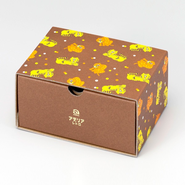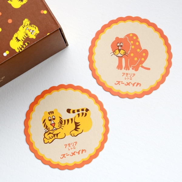 動物園の人気者をユニークなタッチで描いた「ズーメイト」は、昭和51(1976)年に発売された柄です。眠そうなヒョウとおとぼけ顔のトラがかわいらしく、思わずクスッと笑ってしまいそうな、チャーミングな表情をしています。