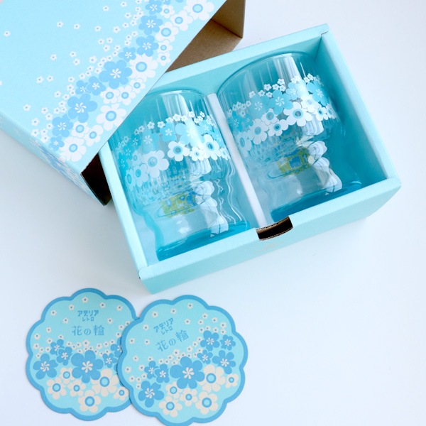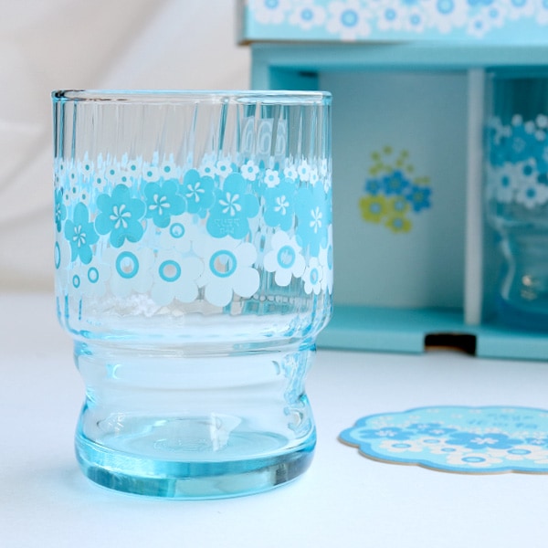 白と水色の組み合わせが爽やかな「花の輪」は、昭和51(1976)年に発売された柄です。昭和当時はクリアブルーのグラスにプリントされていました。大小のポップなお花が咲きこぼれた、動きのあるデザインが印象的。涼やかな色合いのお花が何軸も重なり合うように描かれ、可憐で優しい雰囲気になっています。