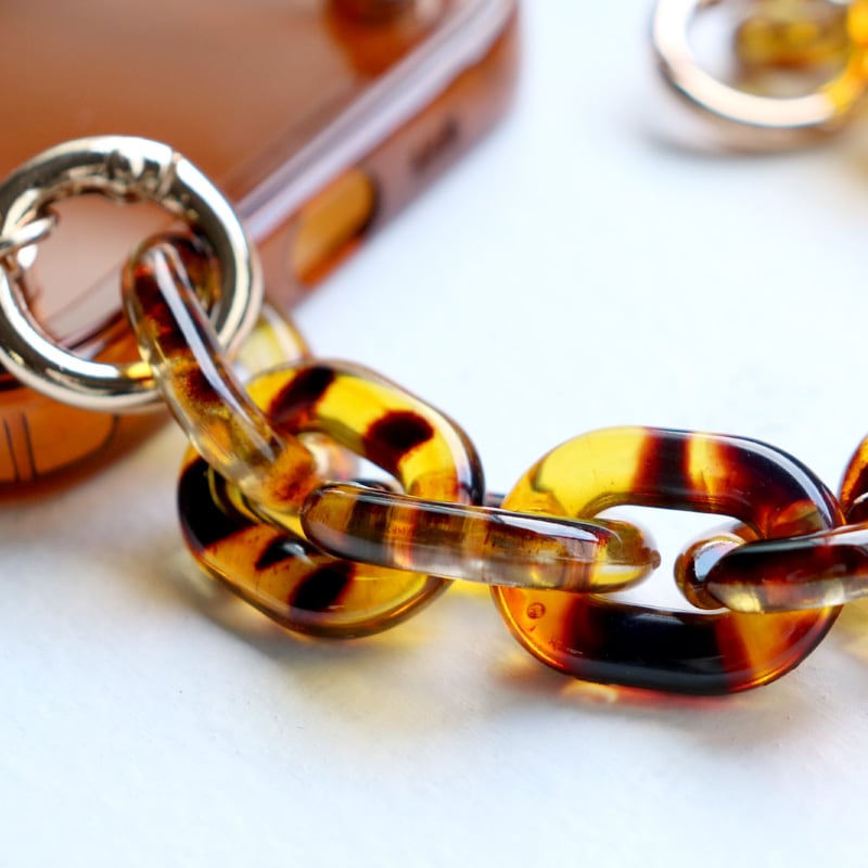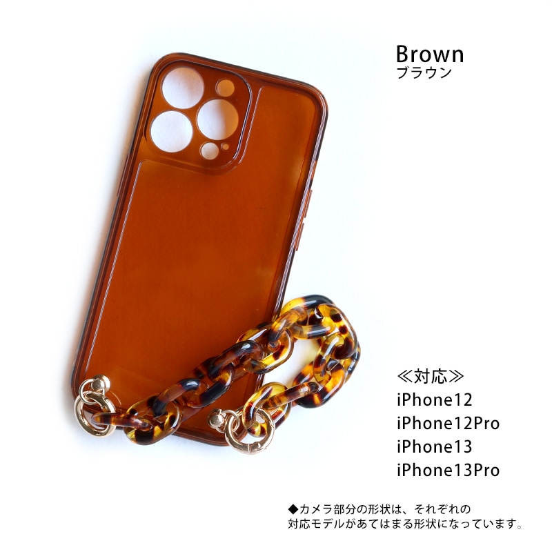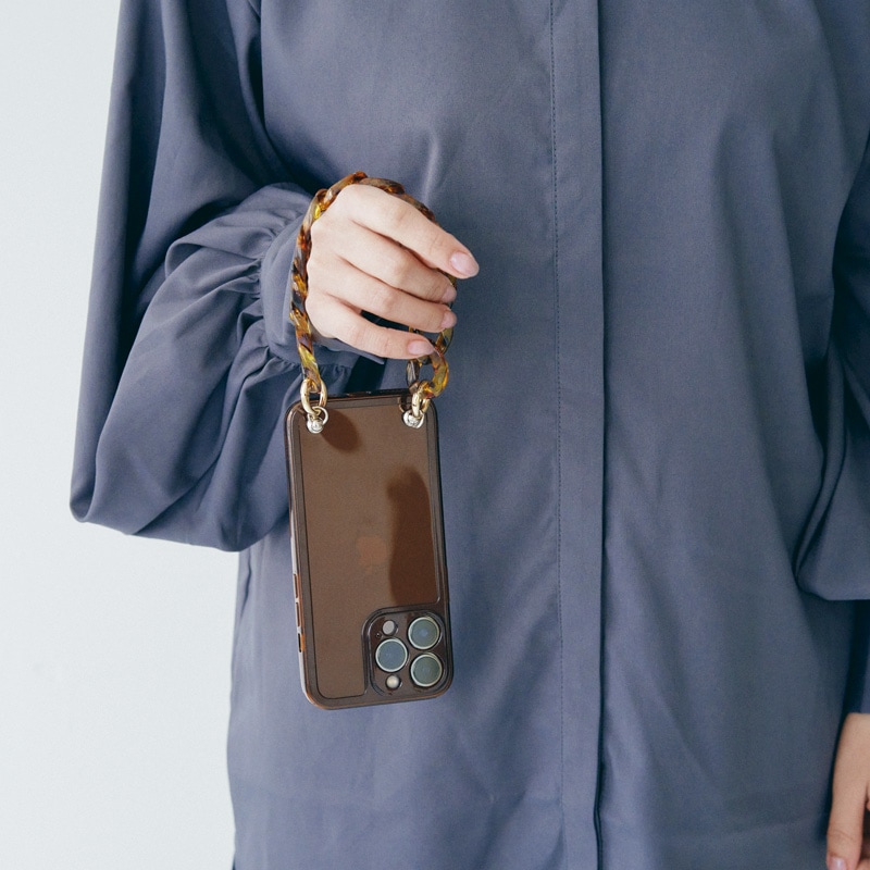iPhone12・iPhone12Pro・iPhone13・iPhone13roの各ケースに存在感のあるチェーンストラップがついているセットです。シンプルなブラウンのクリアケースにべっ甲のチェーン、べっ甲柄のケースにはブラウンのチェーンがセットになっています。ストラップは簡単につけ外しが可能!お手持ちの物と付け替えて楽しむのも◎アクセサリー感覚で使えるのに機能的でとても便利です。