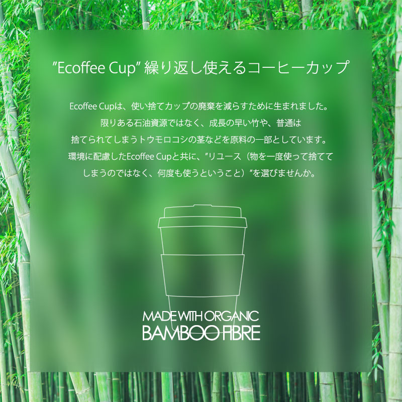 「使い捨て紙コップを使うのは、ここで終わりにしよう! そして、リユースを選ぼう」変わらなくてはならないという想いからEcoffee Cup は生まれました。リユースとは、ものを一度使って捨ててしまうのではなく、何度も使うということ。使い捨て紙コップが減ることにより、ゴミを削減することができます。カップ本体は、バンブーファイバー(竹の繊維)、トウモロコシ繊維、などから出来ています。限りある石油資源ではなく、環境に配慮した素材で作られています。カップのデザインは、ウィリアム・モリスがデザインした作品がベースになっていて、インテリアのようにおしゃれです♪