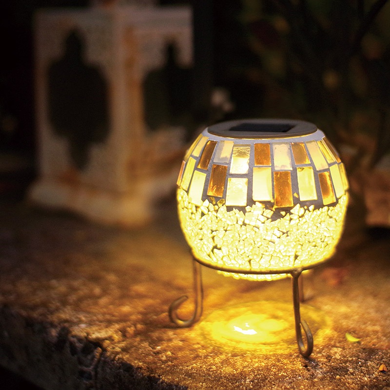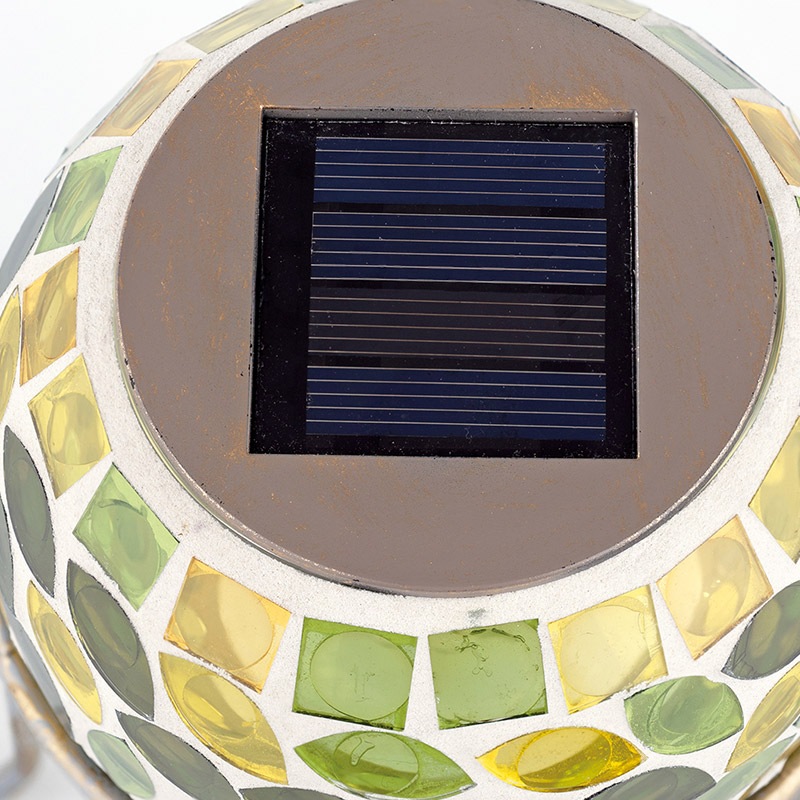 「昼」と「夜」2つの表情を楽しめるソーラーガーデンライトです。昼はモザイクガラスに太陽の光が差し込む透明感ある表情、夜になると太陽光で充電された光が自動で点灯し、地面にうつる影までうっとり美しい夜の表情に。日中十分日差しが当たるところに置いておくと、暗くなると明暗センサーで自動点灯します。電源要らずでとってもエコ!満充電で約8時間点灯します。雨の日でも屋外に設置しておける屋外用防雨型です。暗い夜の玄関先やお庭、バルコニーを幻想的な光で包み置くだけで簡単に設置できるガーデンライト。お庭づくりを楽しんでみてはいかがですか。