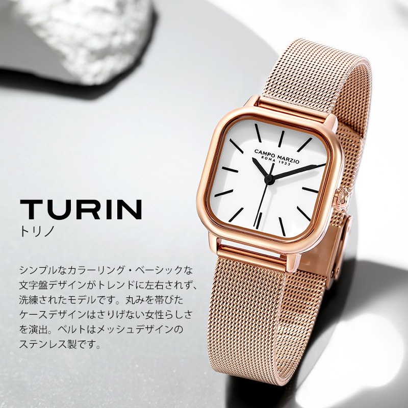 ステーショナリーから革小物まで幅広く展開中のイタリアブランドのCAMPO MARZIOのWATCHシリーズが日本発上陸。カンポ マルツィオの腕時計は、独自の世界観を時計に落とし込んだモデルが多く、ON/OFF様々なシーンで使いやすく日常を華やかにしてくれます。「TURIN/トリノ」は、シンプルなカラーリング・ベーシックな文字盤デザインがトレンドに左右されない洗練されたモデルです。丸みを帯びたケースデザインはさりげない女性らしさを演出。メッシュベルトは錆びにくいステンレス素材です。