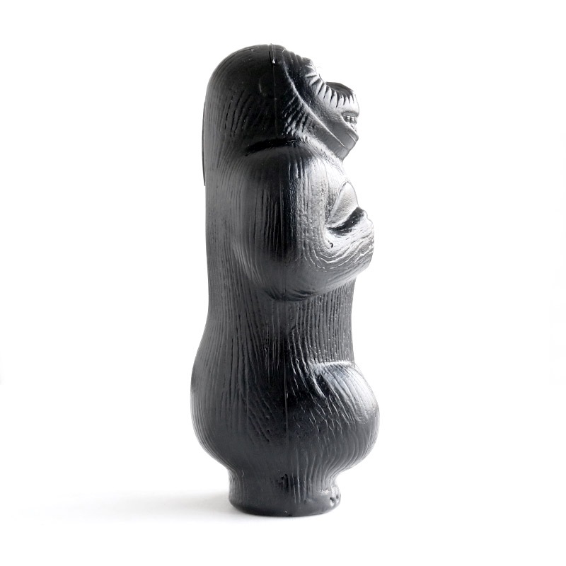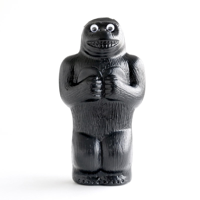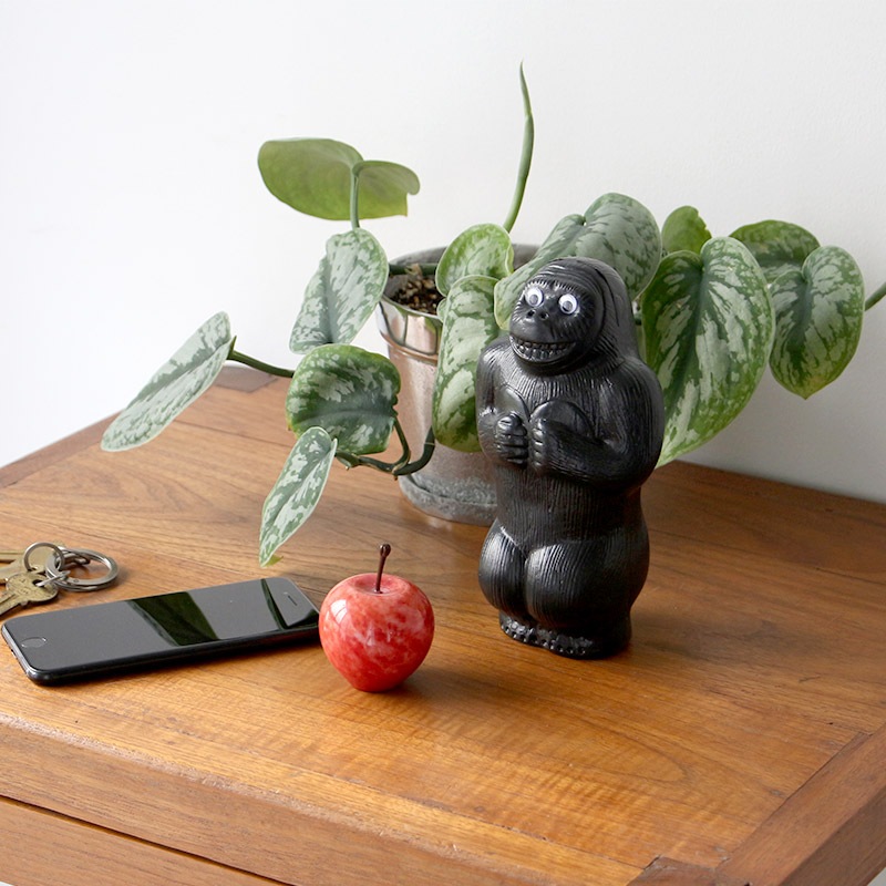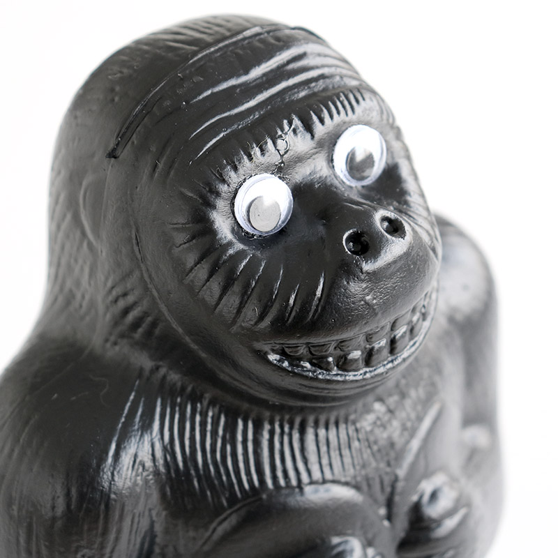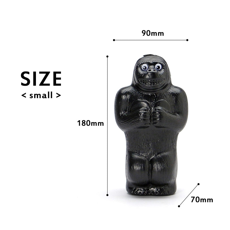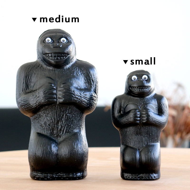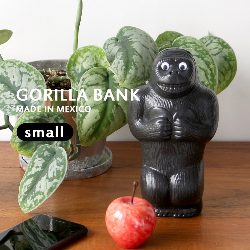 メキシコからやってきたゴリラの貯金箱。1933年に制作された映画「キングコング」では薄気味悪い笑みを浮かべて胸を叩くシーンがあり、その薄気味悪さと愛嬌の間のような絶妙な表情は強く印象に残ります。そんな当時のキングコングに影響を受けたであろうゴリラバンクです。胸を叩くドラミングは拳ではなく手のひらで叩きますが、このゴリラバンクもその仕草が意識されています。ドラミングは決して相手を威嚇する行動だけではなく、戦わずして平和的にことを収めるためのサインでもあります。SサイズとMサイズでは、若干表情が異なります。ボディはプラスチック製のため軽量ですが、コインを入れていくことで安定感が増していきます。貯金箱としてはもちろん、TV横にディスプレイしてみたり、中に砂を入れて安定させて置物にしてみたり、そんな飾り方も楽しめそうなアイテムです。
