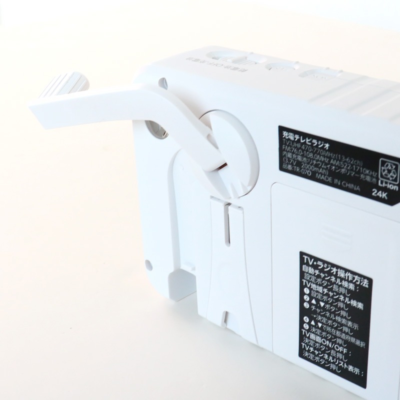 | 使用時間の目安 | ■内蔵バッテリー(満充電時) ワンセグTV:約6時間 ラジオ:約26時間 ■アルカリ乾電池(新品時) ワンセグTV:約3.5~4時間 ラジオ:約22時間 ■手回し充電(1秒間に2回転を10分間回した場合) ワンセグTV:約5分 ラジオ:約30分 ※スピーカー音量:中程度 |