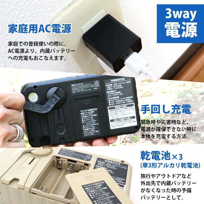 「普段から使っていれば緊急時でも迷わない」をコンセプトに開発された多機能防災ラジオ。防災グッズを備えて終わりにするのではなく、日常的に使うことで緊急時でも操作や保管場所に迷わない製品を目指しています。ポータブルテレビラジオは6つの頼れる機能(ワンセグTV・FMラジオ・AMラジオ・LEDライト・サイレン・携帯電話充電)と3way電源+α(AC電源・手回し充電・乾電池・内蔵バッテリー)仕様。緊急時に役立つ機能が集約されたラジオとなっています。一家に一台常備しておきたいアイテムです。
