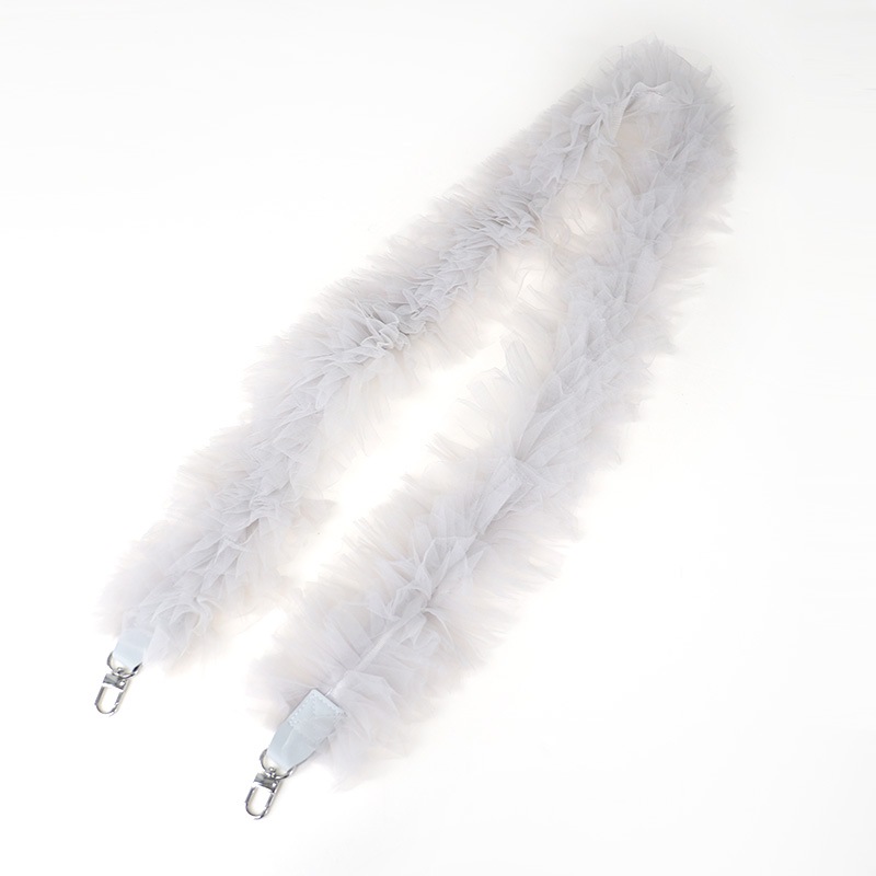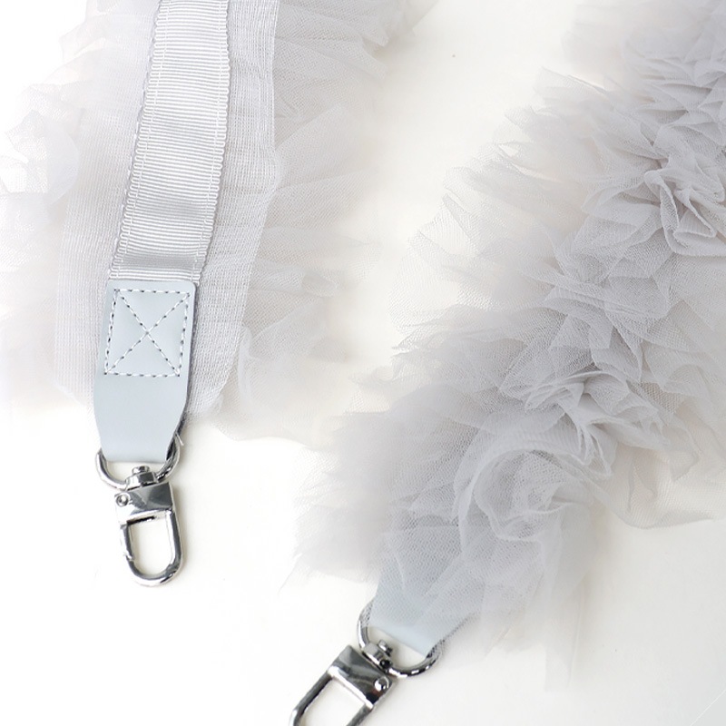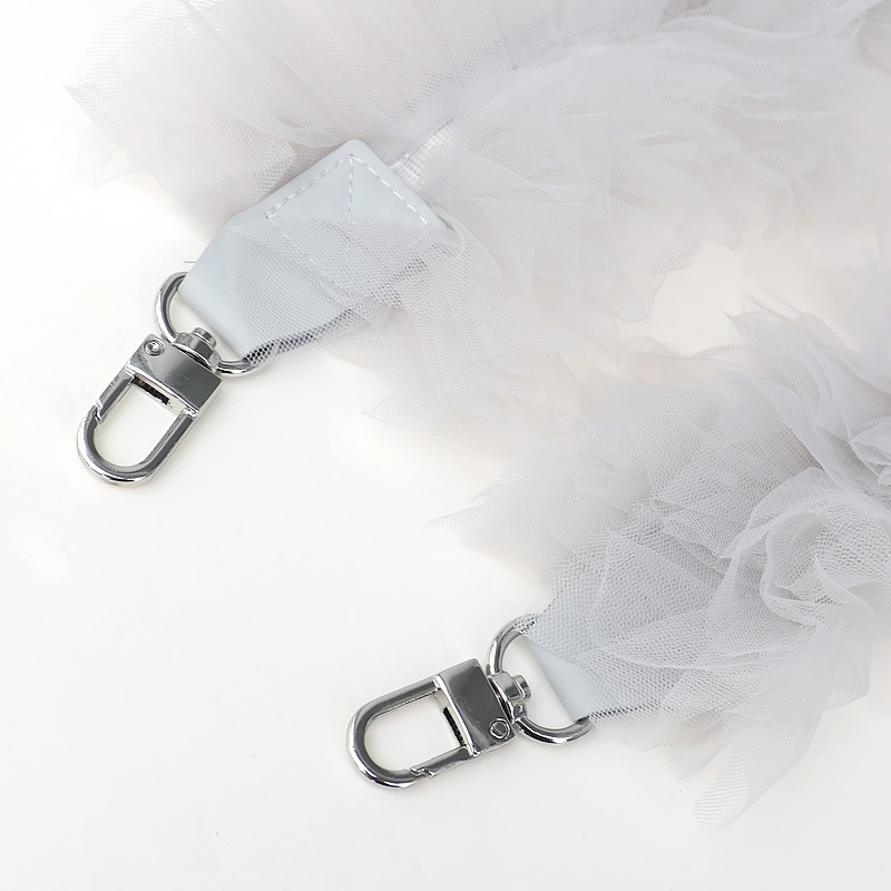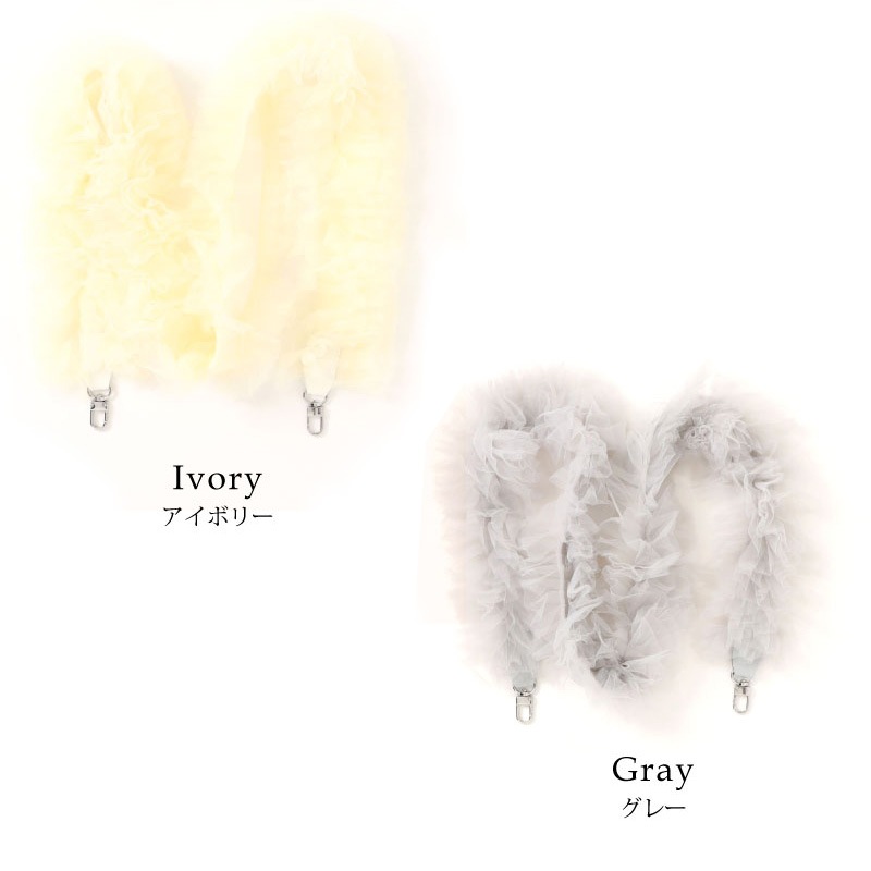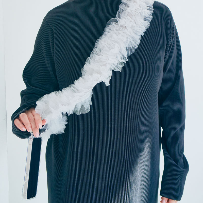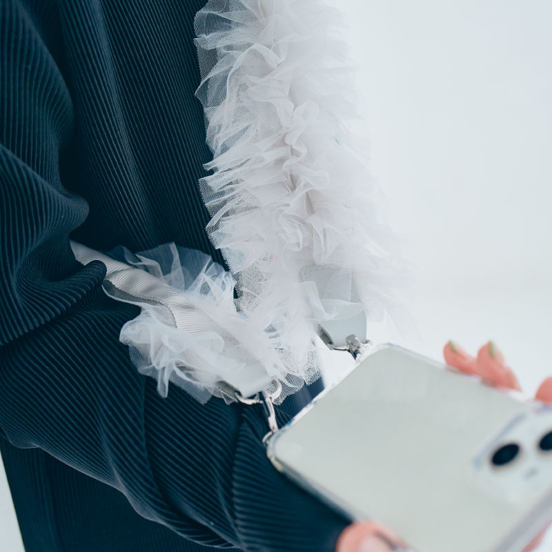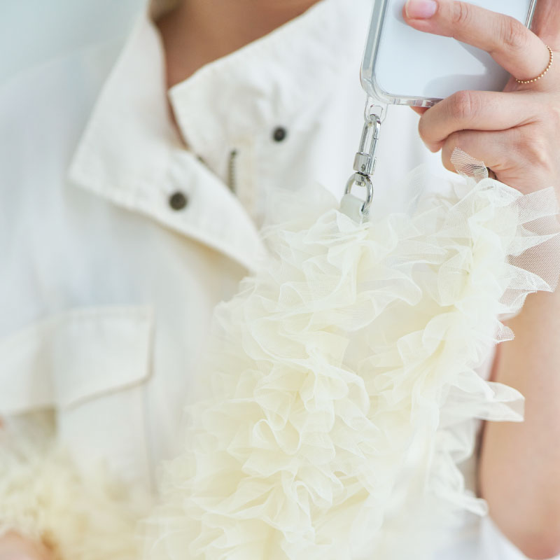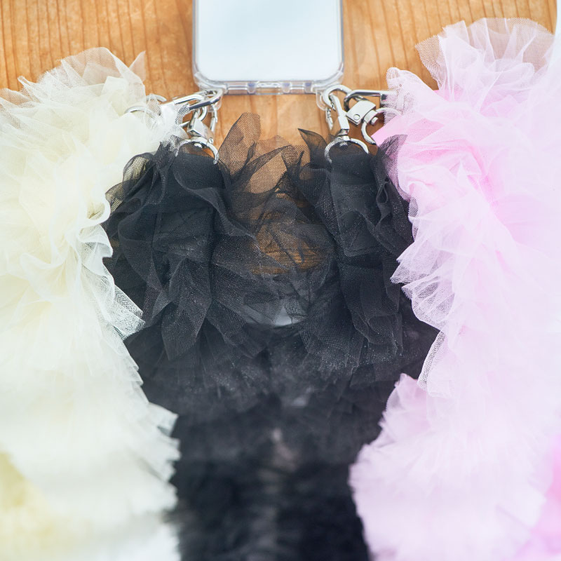 いつものコーディネートにプラスワン!お出かけがもっと楽しく、もっと身軽になる、トレンドのチュール素材を使ったスマホショルダーストラップが登場です。ふんわりとしたチュールが肩に優しくフィットし、長時間使用しても疲れにくいのが魅力。存在感のあるフリフリデザインで、シンプルコーデやカジュアルスタイルにも一気に華やかなアクセントを加えてくれます。ガーリーなスタイルはもちろん、モードなファッションの外しとして取り入れるのもおすすめです。ブラック、アイボリー、ピンク、グレーの4色展開で、その日の気分やファッションに合わせてチョイスできます。