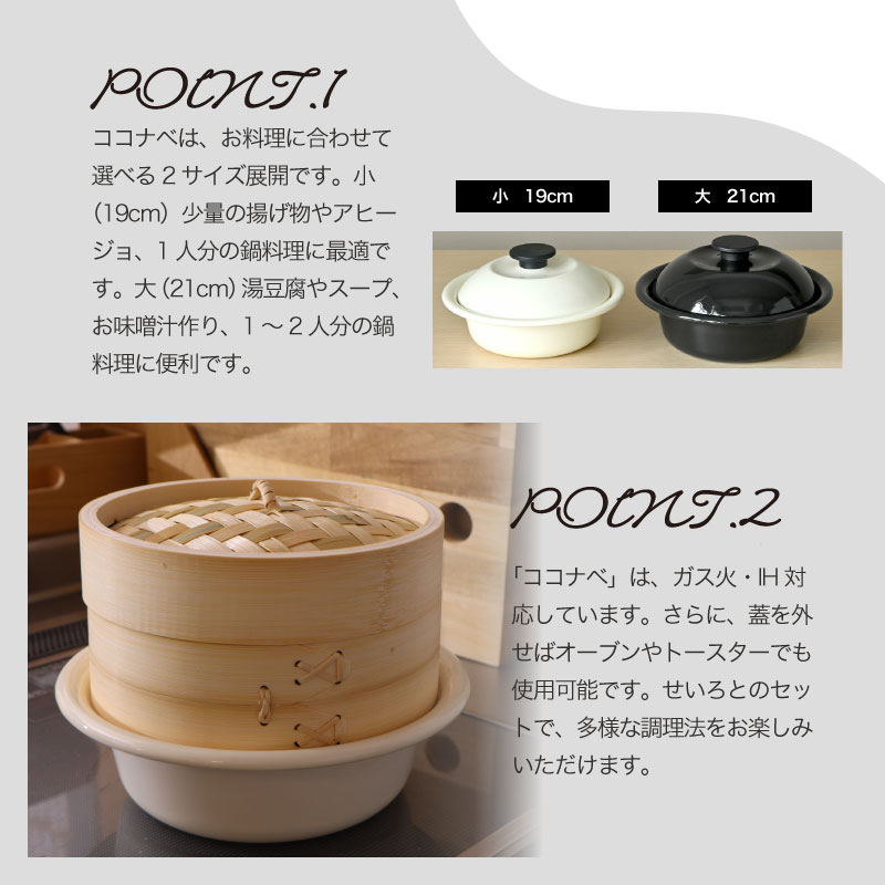 コンパクトで万能なココナベ(個々鍋)と、本格的な蒸し料理が楽しめる中華せいろのセットです。蒸気の力で食材の旨みを引き出し、ふっくらとヘルシーに仕上げるせいろ調理は、忙しい毎日にぴったり。お鍋とせいろがぴったり合うセットだから、届いてすぐに時短で失敗知らずの「せいろごはん」が楽しめます。せいろ料理だけでなく、冷めたごはんの温め直しやスープ、鍋料理などにも大活躍。土鍋感覚でそのまま食卓に出せるデザインで、洗い物も減らせて一石二鳥です。ほうろう製のココナベは、匂いがつきにくく腐食に強いため、調理後の保存も安心。取っ手がないのですっきり冷蔵庫に収まり、蓋を外せばオーブンやトースターでの調理も可能です。下ごしらえ・調理・保存・食卓の4役をこなす、頼れる万能セットです。本製品は重ねて使用できますが、2段までの重ね使いを推奨しております。