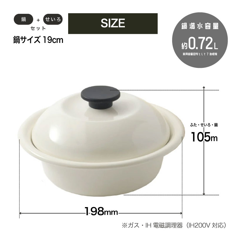 | サイズ | 鍋(本体):約198x105mm、せいろ:約155x68mm |