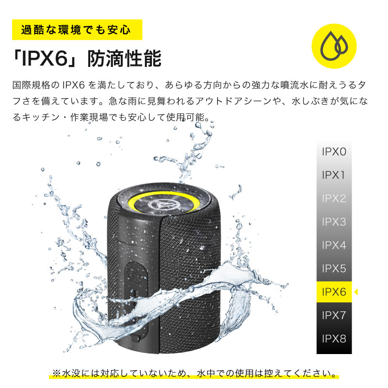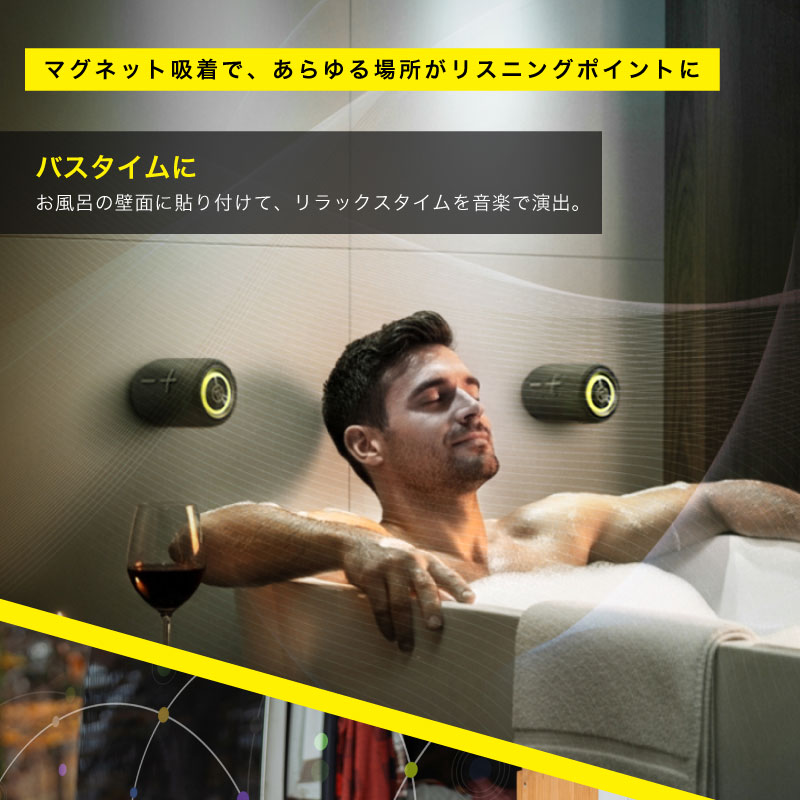 | 注意 | ※水没非対応。浴槽内や水中では使用しないでください。 ※磁気カード、精密機器、時計には近づけないでください。 ※設置面の面積が狭いと、重さで落下する恐れがあります。 ※AUX・SDカード再生は1台のみ対応(ステレオ再生不可)。 ※直射日光や夏場の車内など、高温下での放置は避けてください。 |