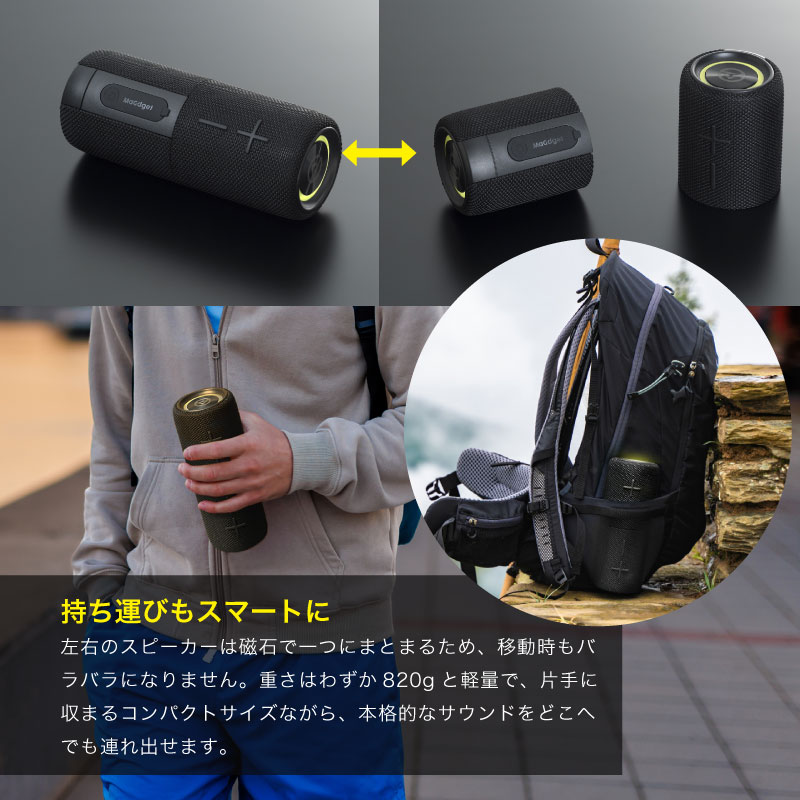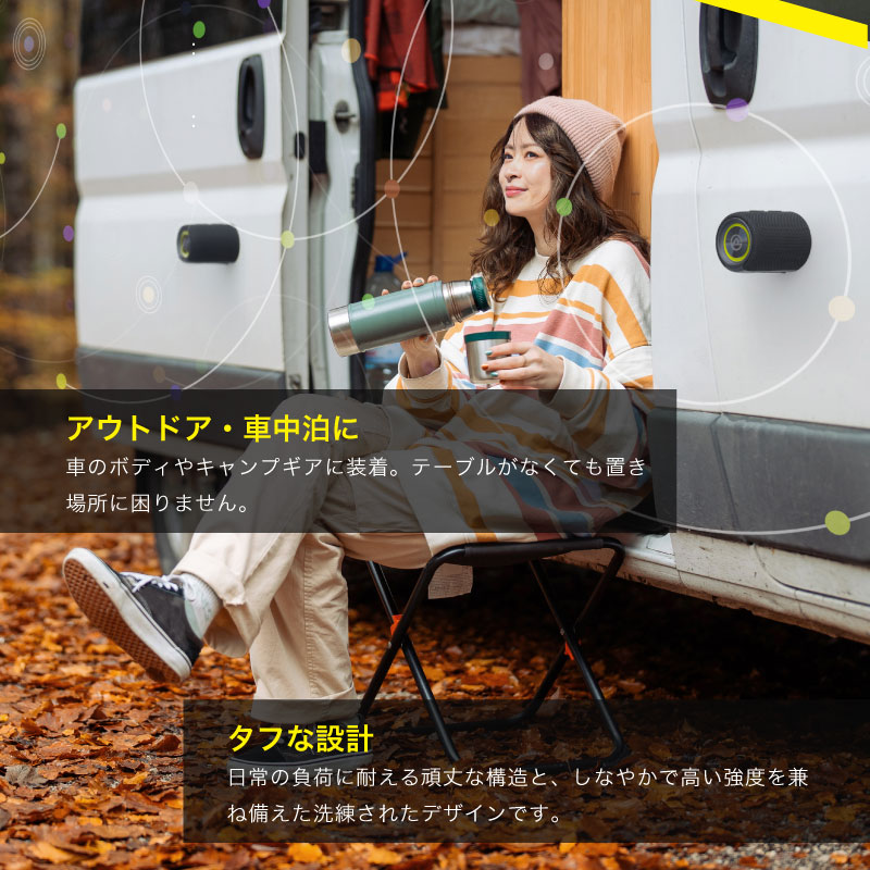 国内クラウドファンディングで大きな支持を獲得した、驚きの仕掛けがつまったスピーカーが登場!最大の特徴は、1台のスピーカーを“パカッ”と2台に分離できること。左右に分けて置くだけで、音の立体感と臨場感が一気にアップ!まるで自分だけの小さなシアターを持ち運んでいるような、迫力のステレオサウンドをどこでも手軽に楽しめます。底面には強力な磁石を内蔵しているので、冷蔵庫やお風呂の壁、キャンプのラックなど、金属面ならどこでもピタッと吸着。場所を選ばない自由なレイアウトで、お気に入りの音楽が空間いっぱいに広がります。さらにIPX6の防水仕様なので、キッチンやバスルーム、アウトドアでも水しぶきを気にせず安心。最新のBluetooth 5.4搭載で、動画やゲームも遅延なく快適です。洗練されたデザインと驚きの機能性は、音楽好きな方はもちろん、キャンプやガジェットが好きな方への特別なプレゼントとしても大変おすすめです。これまでにない「音を分ける」楽しさを、ぜひ体感してみてください。