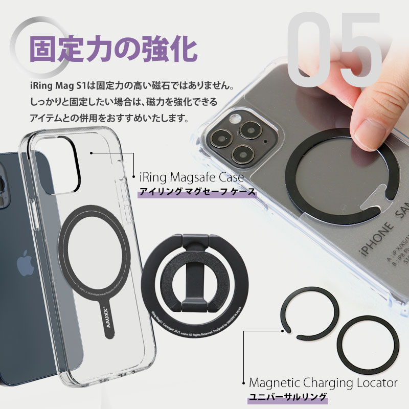 | 注意 | ※MagSafeに対応していないケースで使用できません。 ※スマートフォンの背面材質・形状によってはご使用いただけない場合があります。 ※全てのケースでの対応の保証はしておりません。 ※本製品の利用による本体の紛失、破損、汚れ、および内部データの破損には一切保証いたしかねます。 ※本製品はスマートフォン端末の落下を防止するものではなく、そのために生じたいかなる損害についても責任を負いません。 ※本製品を使用することで、ケースやiPhone本体に使用痕が残ることがあります。 ※iPhone本体に直接装着した場合、マグネットの磁力が弱くリングだけを持つと本体から外れてしまう場合がございます。しっかりと固定したい場合は、マグセーフ対応のiPhoneケースとの併用をお勧めいたします。 ※磁石の素材および強度は変更しておりません。そのため、製品による個体差はございませんのでご安心ください。 |