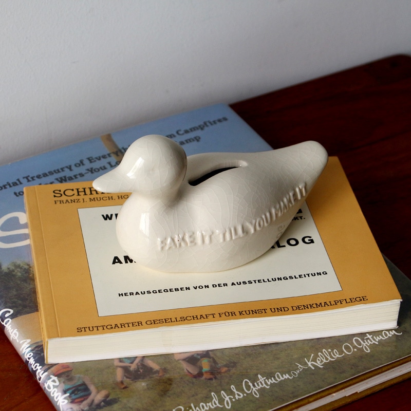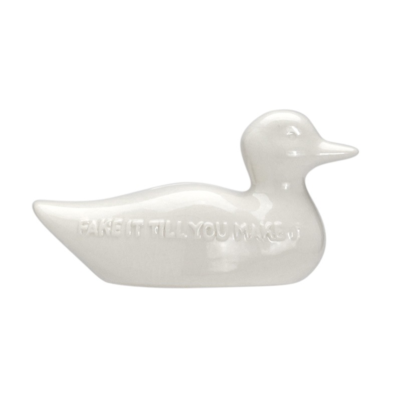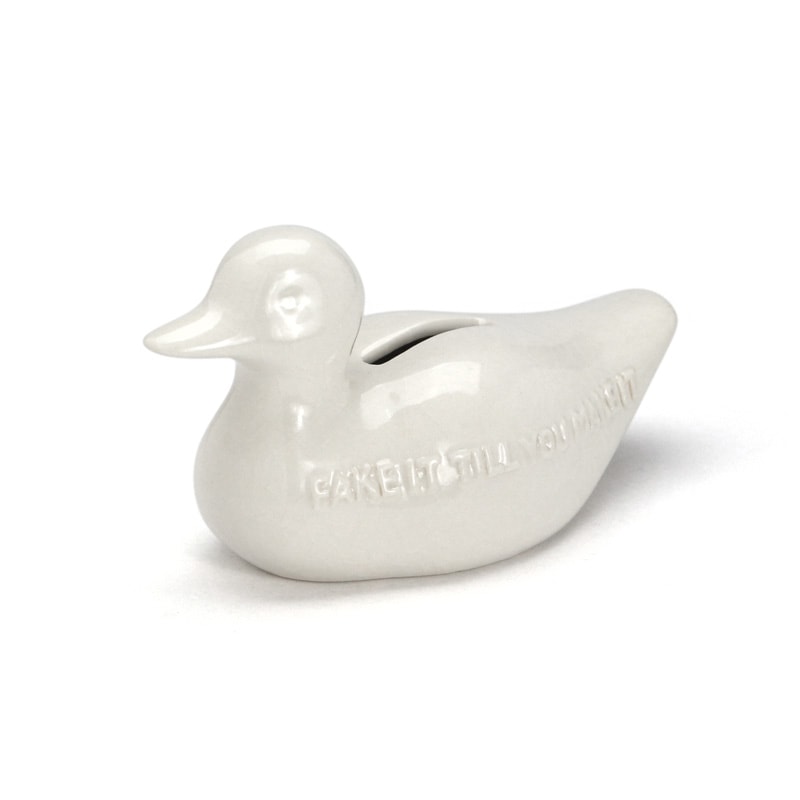 かつて狩猟の囮として使われていた「デコイ」をモチーフにした、貫入仕上げの陶器製貯金箱。本物のような佇まいと、空間に溶け込む静かな表情を追求しました。ボディには「FAKE IT TILL YOU MAKE IT(なりきっているうちに本物になる)」というメッセージを刻印。コインを落とすたびに陶器特有の澄んだ音が響き、日々の貯金を心地よいひとときへと変えてくれます。底面にはラバー製の蓋を備え、実用性にも配慮した一品です。