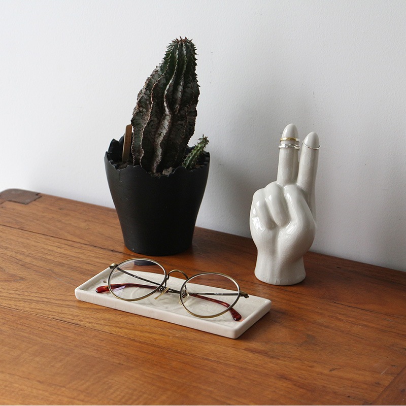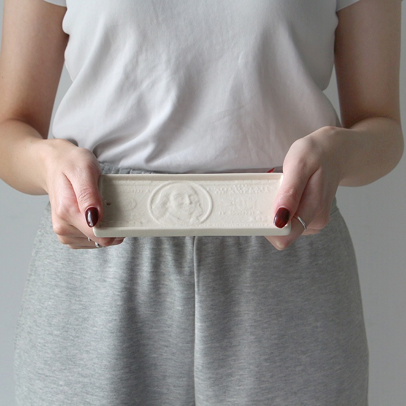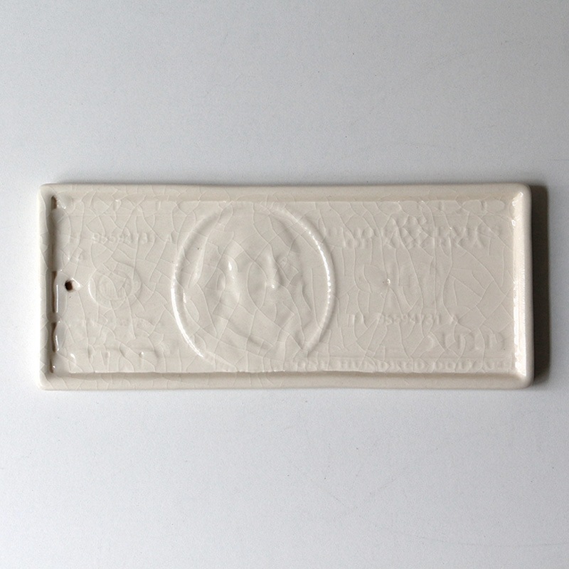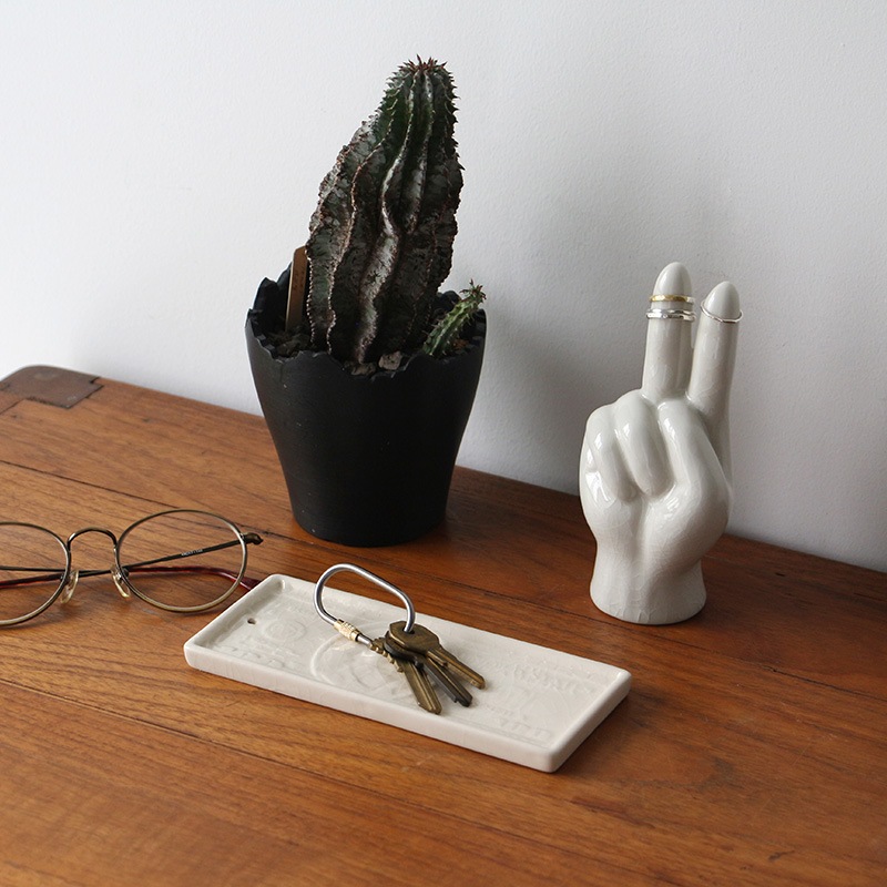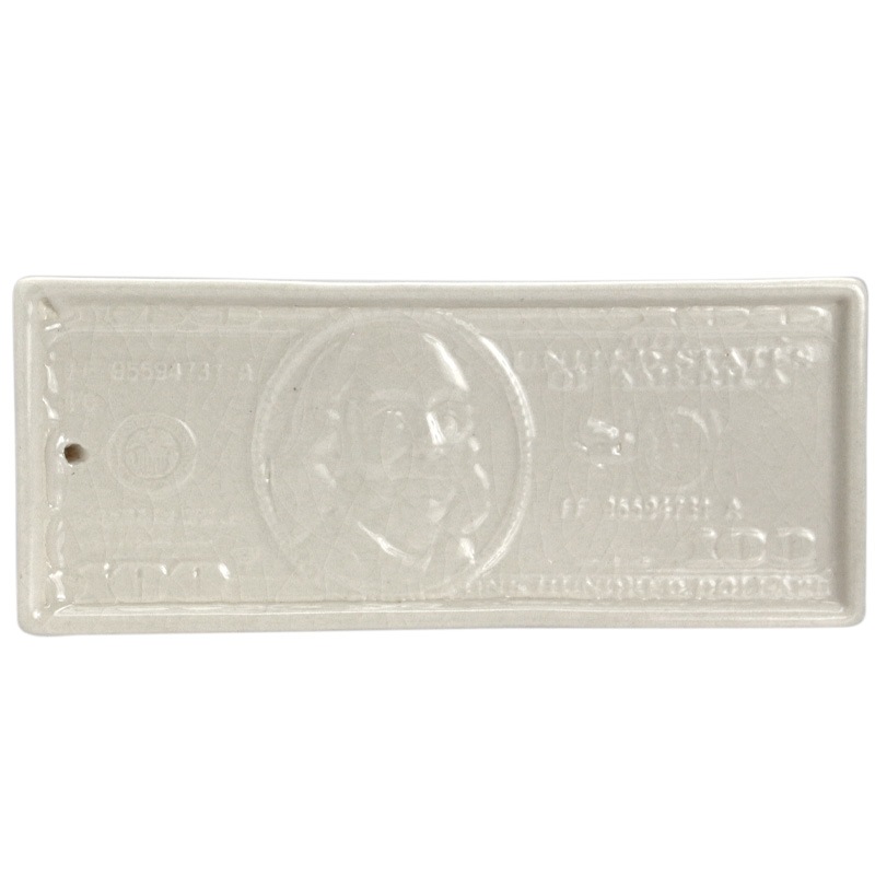100ドル札をモチーフにした、グラフィカルで遊び心あふれるトレイ。陶器ならではの柔らかな温もりが、現代的なデザインの中に心地よい調和を生み出しています。マネートレーや小物入れとしてはもちろん、サイドのホールにインセンスを立てれば、お香立てとしても活躍。実用性と高いデザイン性を兼ね備え、インテリアとして日常に自然と溶け込む多機能なアイテムです。