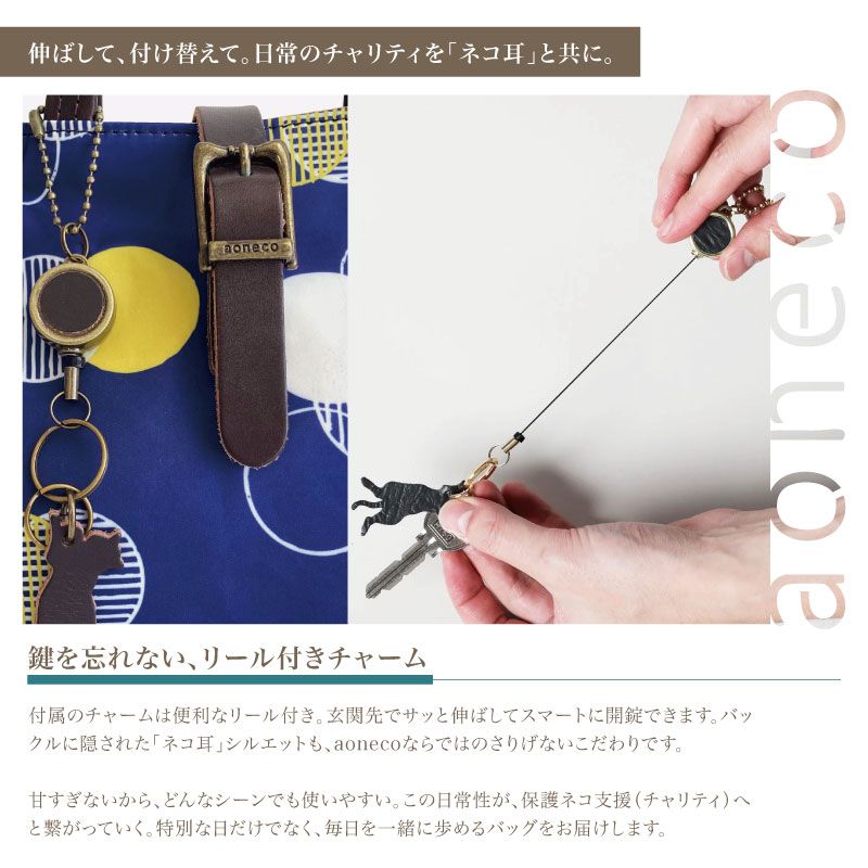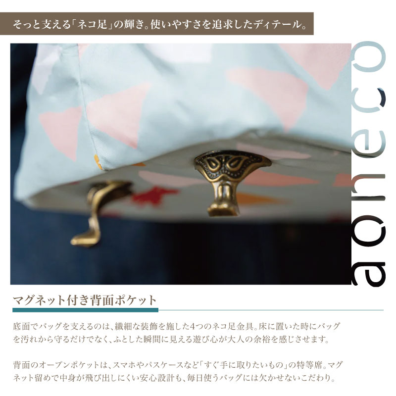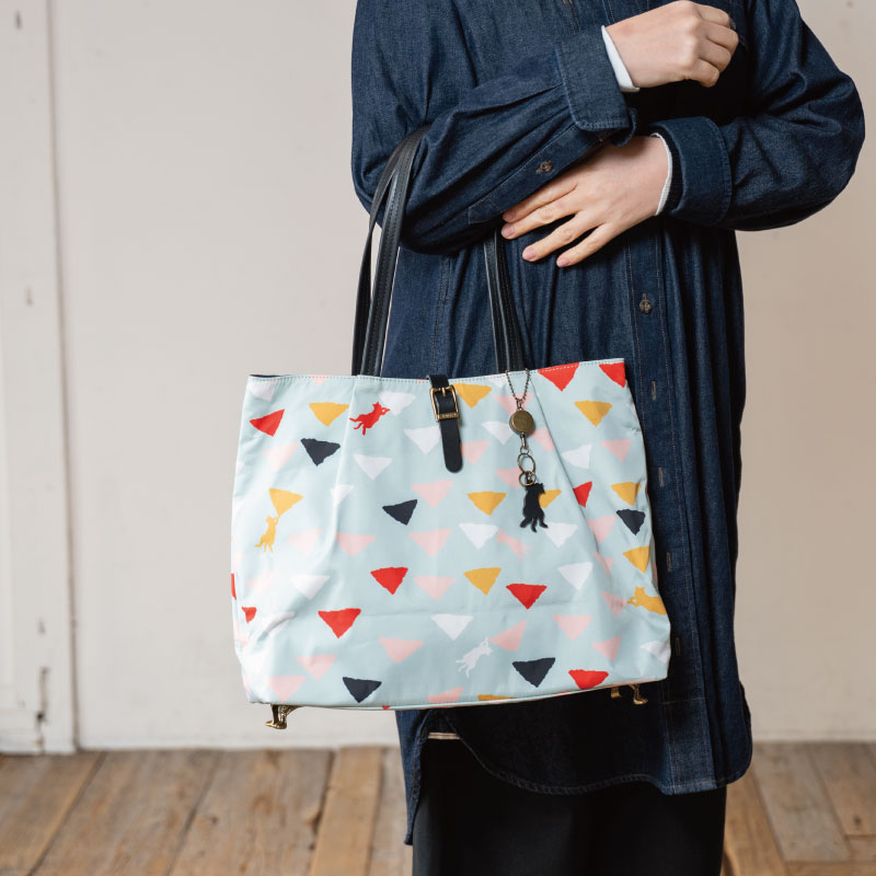 「底がネコちゃんの足になってる!」と思わず指さしてフフッと笑みがこぼれてしまう、上品で遊び心たっぷりなファブリックトートが登場しました。一番のこだわりは、バッグの底でちょこんと支える「ネコ足シルエット」の底鋲です。アンティークな風合いの金具が、床に置いたときもバッグを汚れから守ってくれるという、見た目以上の頼もしさ。パステルグリーンやネイビーといった大人っぽいテキスタイルに、さりげなくネコ耳が隠れたバックルなど、甘すぎない「厳かなネコ」のデザインが、毎日の通勤からお出かけまでを上品に彩ります。450gと驚くほど軽いのに、A4ファイルもタブレットもすっぽり入る大容量。さらに、玄関先で「鍵どこだっけ?」と慌てずに済む、伸びるリール付きのネコちゃんチャームがとっても優秀です。このチャームは気分で付け替えたり、他のバッグにお引越しさせたりしてもOK!毎日使うバッグが、誰かの優しさに繋がるチャリティアイテム。自分へのご褒美にはもちろん、「使いやすさも可愛さも、どちらも譲れない!」という方へのギフトにもぴったりです。持つだけで、ちょっぴり心まで軽やかになれるバッグを相棒にしてみませんか?