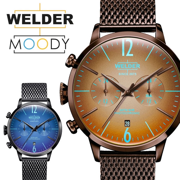 WELDER/ウェルダーの中でも一番の注目モデルMOODY(ムーディー)。 光の角度に応じて色を変える偏光ガラスのフォトクロミックグラスを採用した腕時計。 プレーンなダイヤルのデザインは、6時と12時の2つの大きなアラビア数字が配置。ビジネスパーソンに嬉しいデュアルタイム、日付表示の機能も加わっています。