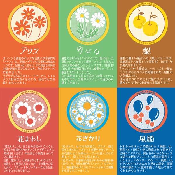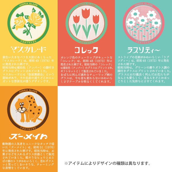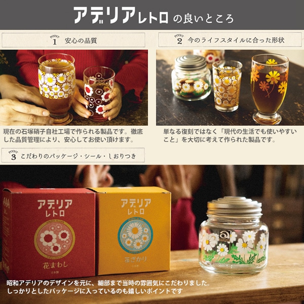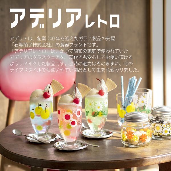 アデリアは、創業 200 年を迎えたガラス製品の先駆「石塚硝子株式会社」の食器ブランドです。「アデリアレトロ」は、かつて昭和の家庭で使われていたアデリアのグラスウェアを、現代でも安心してお使い頂けるようリメイクした製品です。当時の魅力はそのままに、今のライフスタイルでも使いやすい製品として生まれ変わりました。