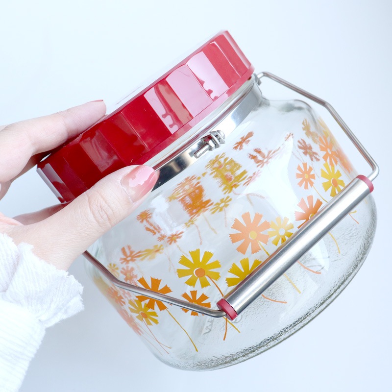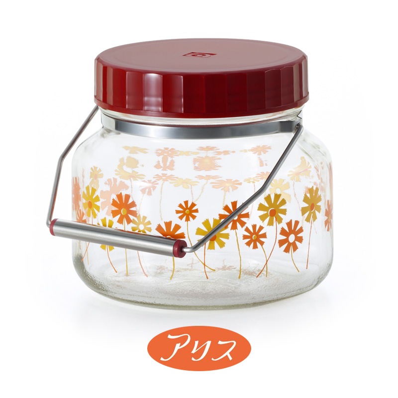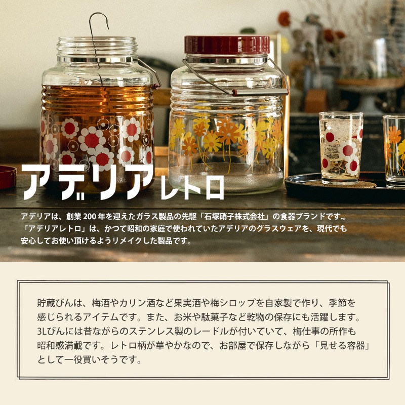 貯蔵びんは、梅酒やカリン酒など果実酒や梅シロップを自家製で作り、季節を感じられるアイテムです。また、お米や駄菓子など乾物の保存にも活躍します。3Lびんには昔ながらのステンレス製のレードルが付いていて、梅仕事の所作も昭和感満載です。レトロ柄が華やかなので、お部屋で保存しながら「見せる容器」として一役買いそうです。