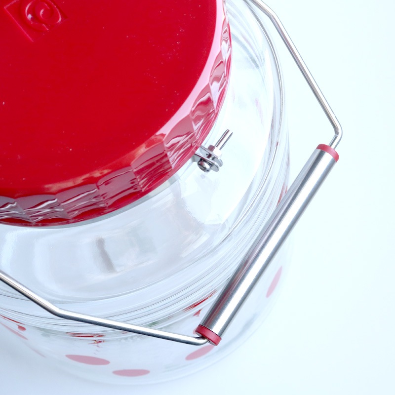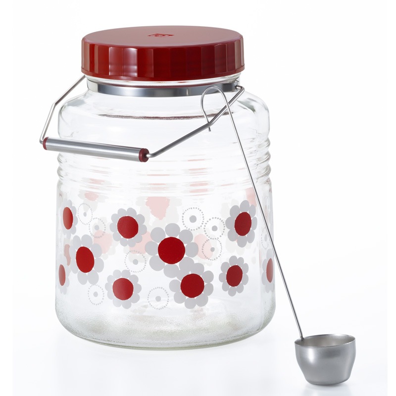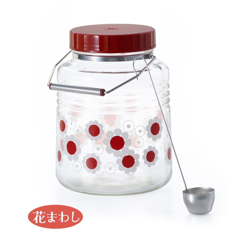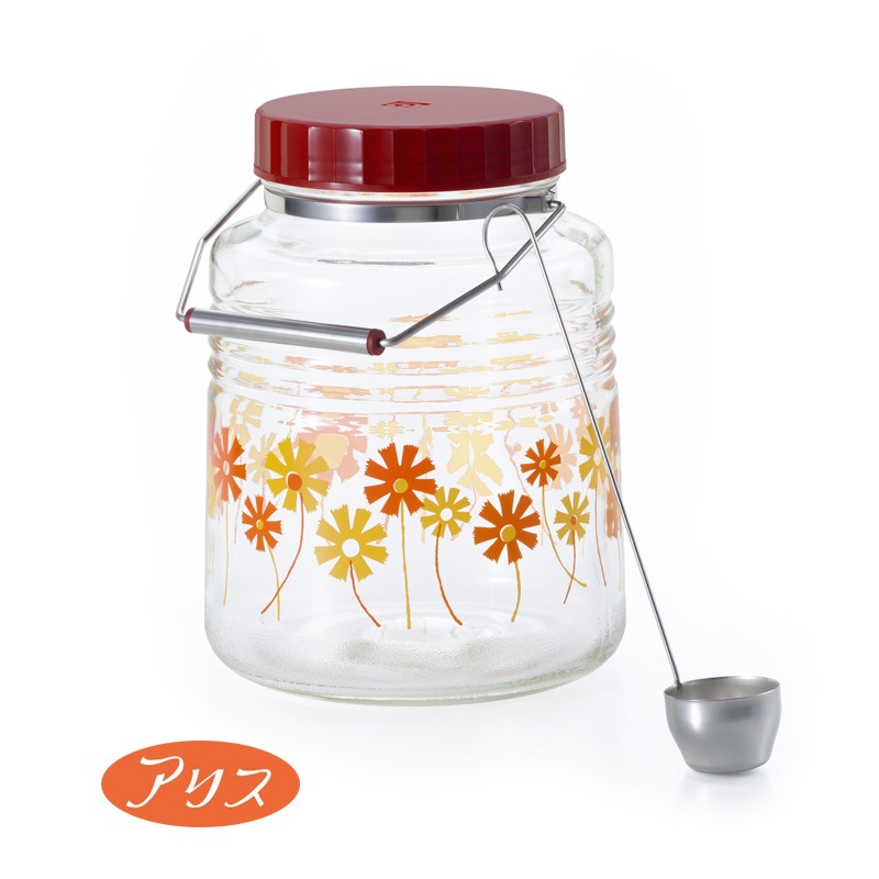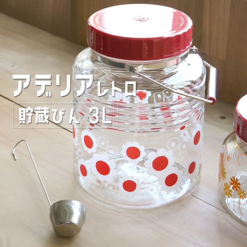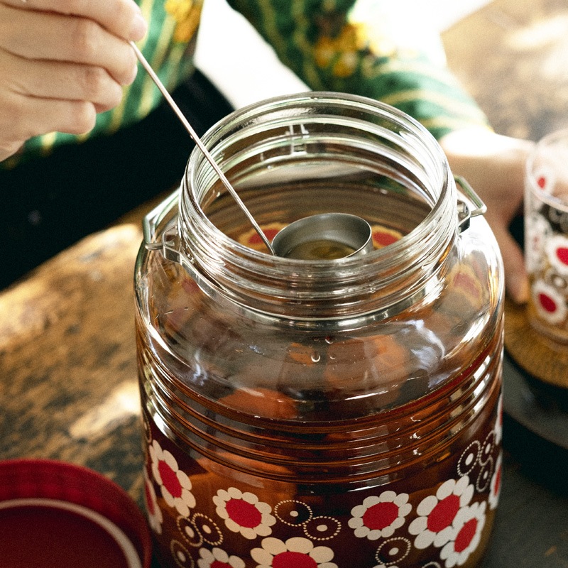 貯蔵びんは、梅酒やカリン酒など果実酒や梅シロップを自家製で作り、季節を感じられるアイテムです。また、お米や駄菓子など乾物の保存にも活躍します。3Lびんには昔ながらのステンレス製のレードルが付いていて、梅仕事の所作も昭和感満載です。レトロ柄が華やかなので、お部屋で保存しながら「見せる容器」として一役買いそうです。