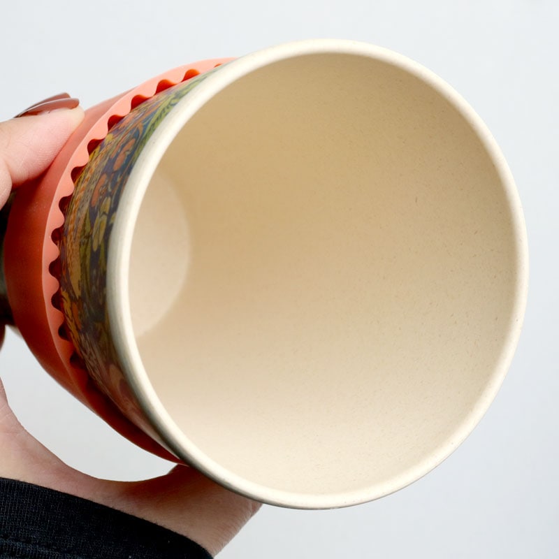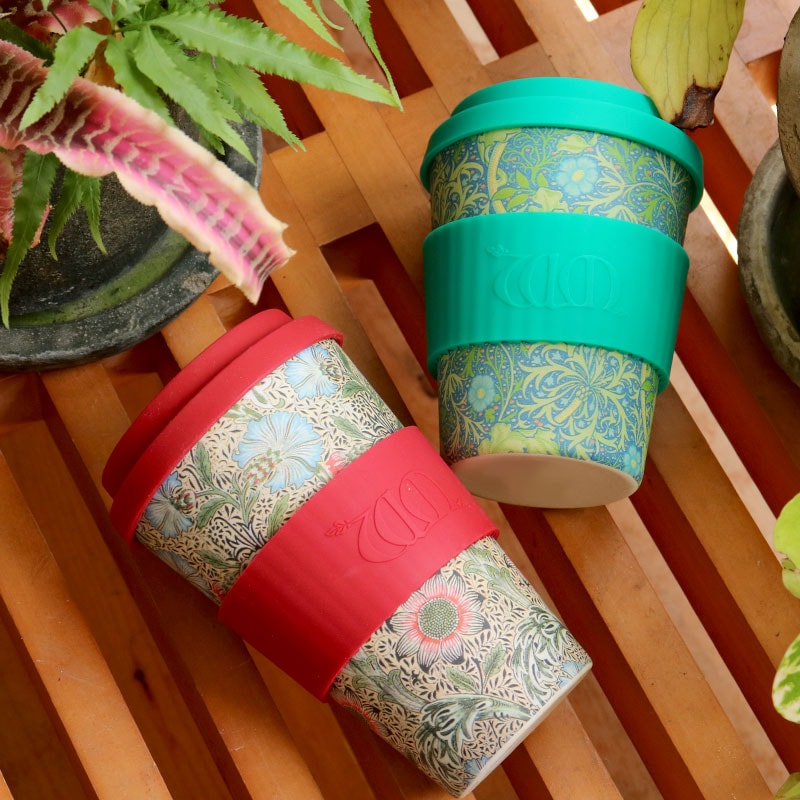 「使い捨て紙コップを使うのは、ここで終わりにしよう! そして、リユースを選ぼう」変わらなくてはならないという想いからEcoffee Cup は生まれました。リユースとは、ものを一度使って捨ててしまうのではなく、何度も使うということ。使い捨て紙コップが減ることにより、ゴミを削減することができます。カップ本体は、バンブーファイバー(竹の繊維)、トウモロコシ繊維、などから出来ています。限りある石油資源ではなく、環境に配慮した素材で作られています。カップのデザインは、ウィリアム・モリスがデザインした作品がベースになっていて、インテリアのようにおしゃれです♪