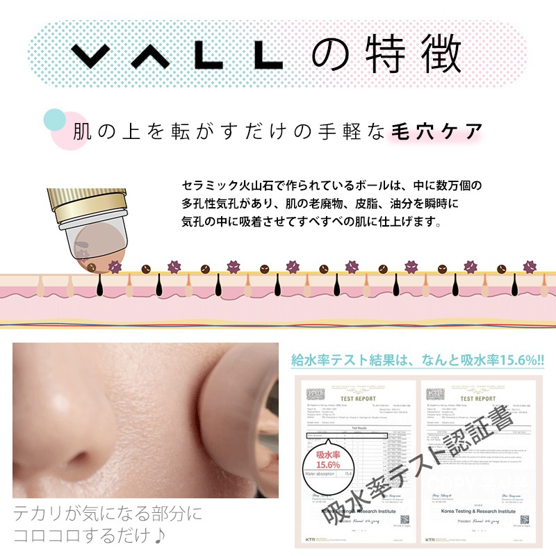 日本最大級のクラウドファンディングサービス「Makuake(マクアケ)」で大きな支持を得た”VALL あぶらとりボール”。あぶらとり紙を繰り返し使えるボール状にした韓国発の美容アイテムです。皮脂のテカリは、化粧崩れの原因となり、肌トラブルにもつながります。また、マスクの着用が日常的となり、マスクによるテカリに悩んでいる方も多いはず。そんな日常の悩みを、使うたびゴミがでる紙ではなく、何度も使用できる"ボール"形状で楽しみながら解決。消臭・抗菌テストでも結果がでているので、安心して繰り返し使用でき、汚れても簡単にクリーニングすることができます。化粧前、化粧後、マスク着用時、もちろん男性にもお使いいただける優れものです。ぜひ、その効果を体感してください!