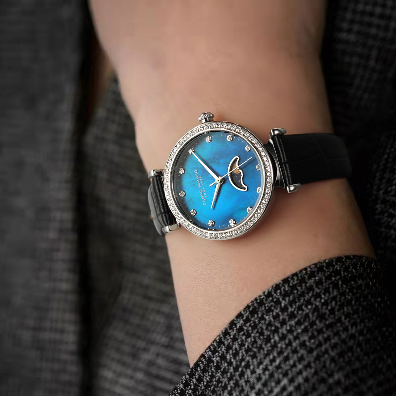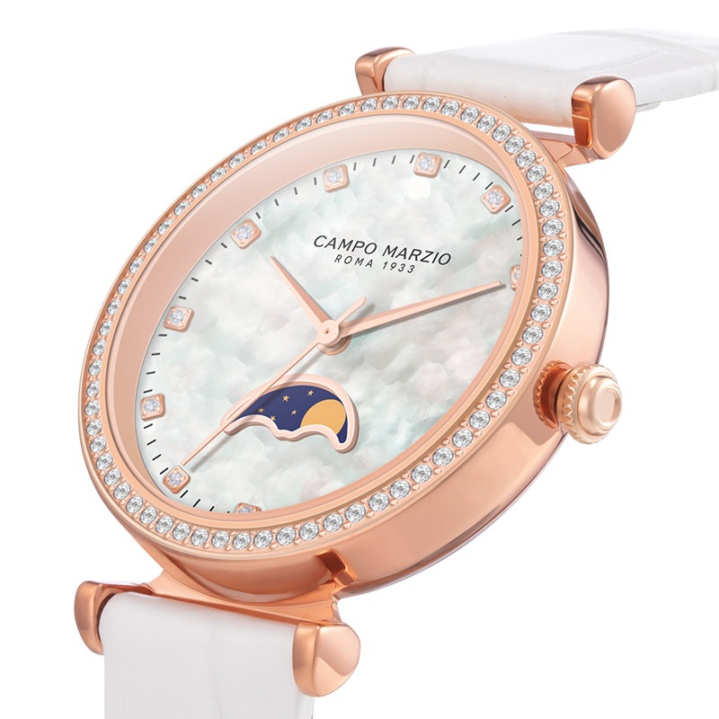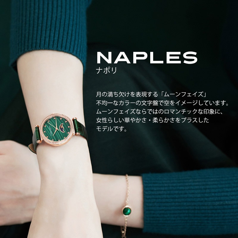 ステーショナリーから革小物まで幅広く展開中のイタリアブランドのCAMPO MARZIOのWATCHシリーズが日本発上陸。カンポ マルツィオの腕時計は、独自の世界観を時計に落とし込んだモデルが多く、ON/OFF様々なシーンで使いやすく日常を華やかにしてくれます。「Naples/ナポリ」は、月の満ち欠けを表現するムーンフェイズ。不均一なカラーの文字盤で空をイメージしています。ムーンフェイズならではのロマンチックな印象に、女性らしい華やかさ・柔らかさをプラスしたモデルです。