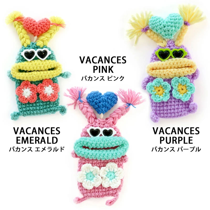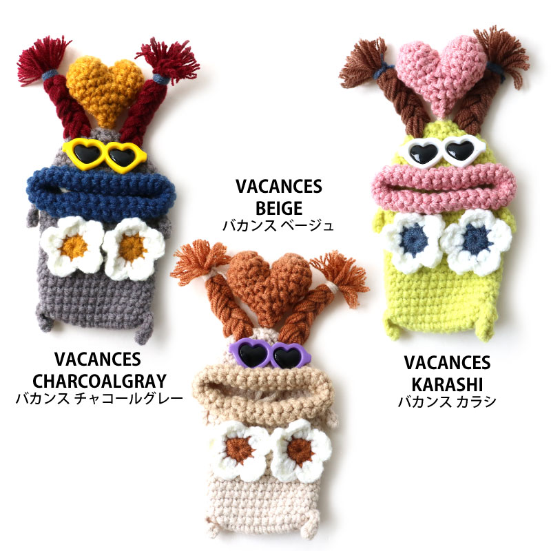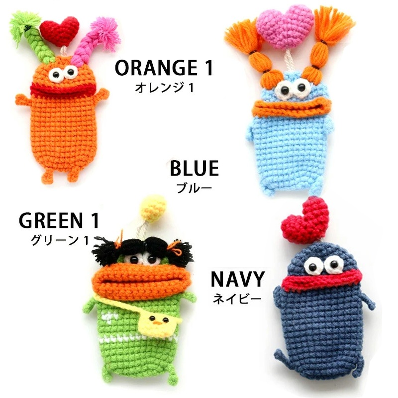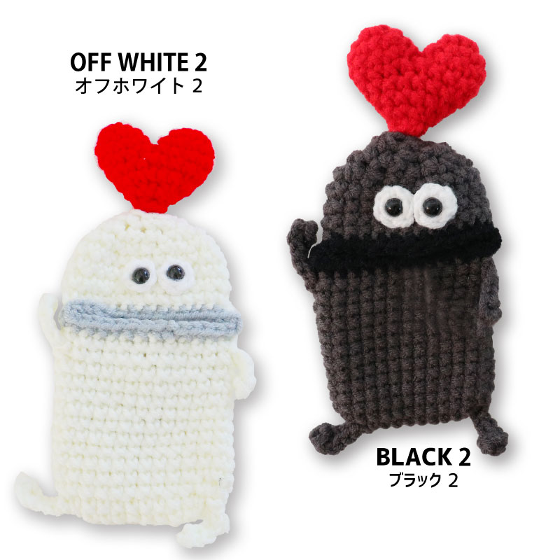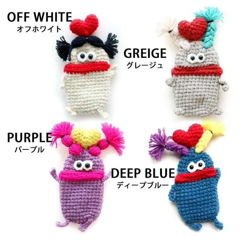 | 注意 | ※ハンドメイドのため、個体差があります。 ※一部、背中側にフックがつけられるよう、毛糸の編み込み仕様が異なるものがございますが、ストラップとしてのご利用はお止めください。本体が落下し、紛失や破損の原因となります。 |