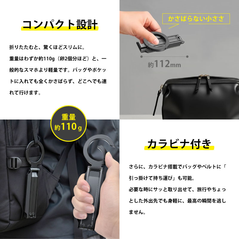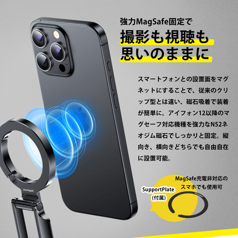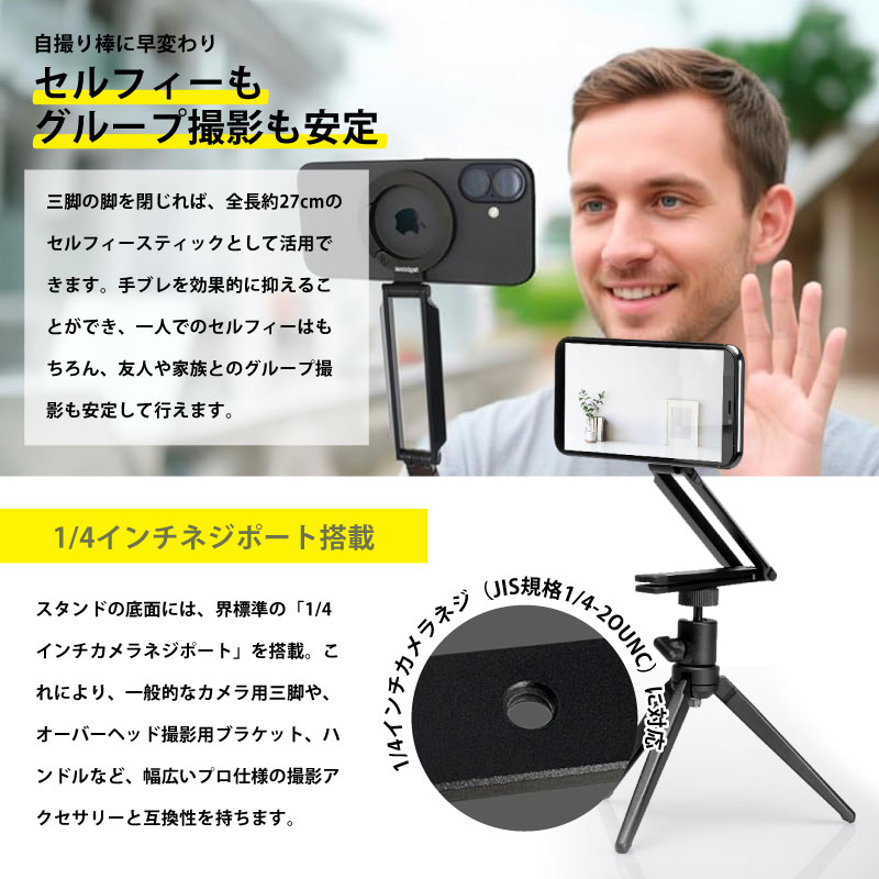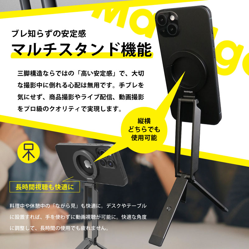 大人気のスマホアクセサリーブランド「MaGdget」から、カラビナ搭載の多機能スマホ三脚スタンドが登場!三脚としてはもちろん、デスク用スマホスタンドや自撮りスティックとしても活躍する多用途アイテムです。本体は軽量かつ高強度のアルミニウムを採用し、頑丈な構造と強力なMagSafe磁石でスマートフォンをしっかりと固定し、落下を防ぎます。さらに、便利なカラビナ付きで、バッグやベルトに掛けて持ち運び可能。旅行や外出先でも身軽に撮影を楽しめます。iPhone 12以降のMagSafe対応機種を強力なN52ネオジム磁石で簡単に固定でき、縦向き、横向きどちらでも自由自在。折りたためば驚くほどコンパクトで、持ち運びにも便利です。ヒンジの固さも調整できるため、自分好みにカスタマイズして使えます。