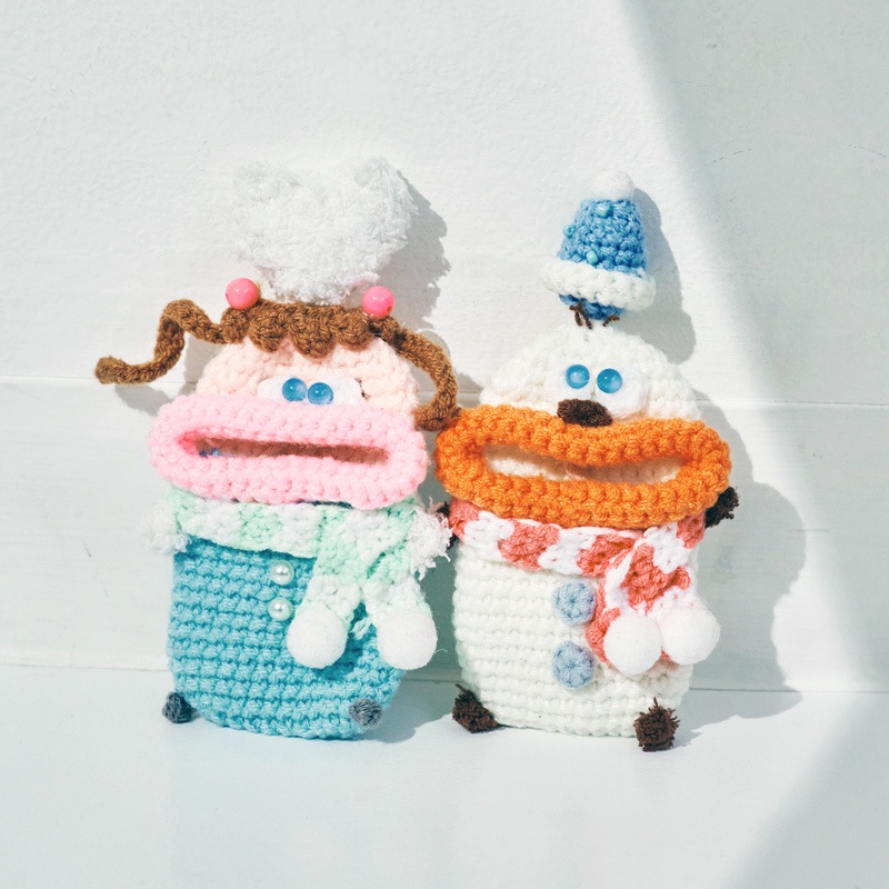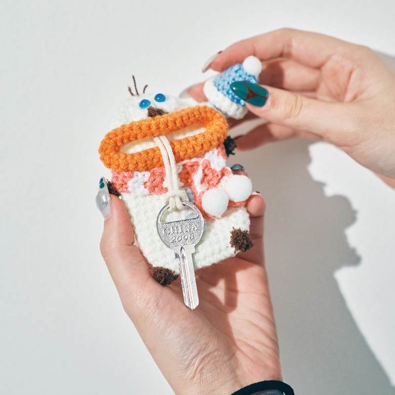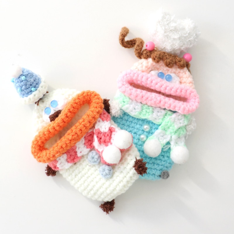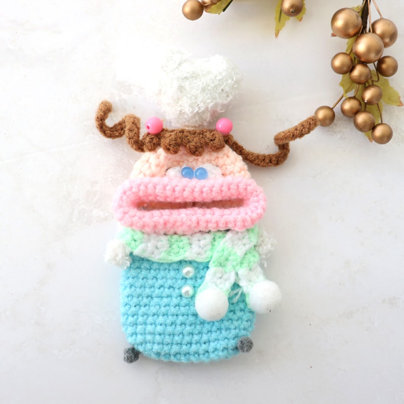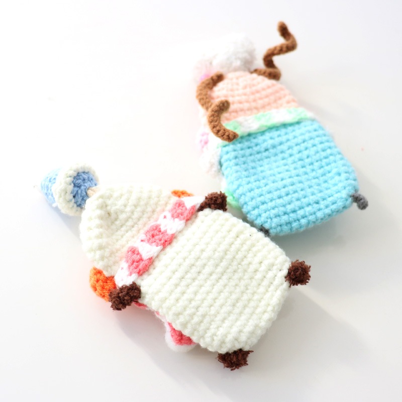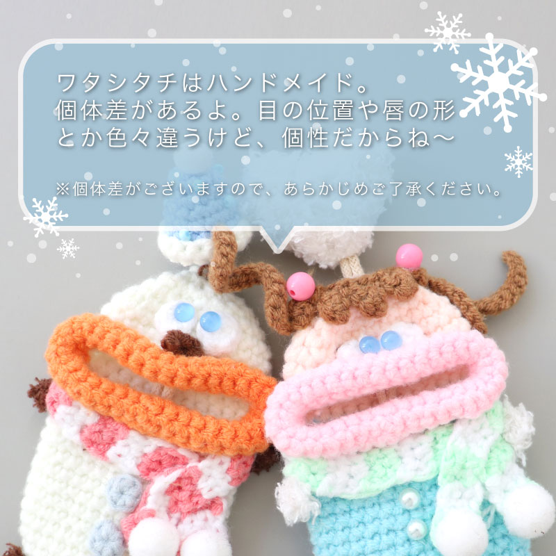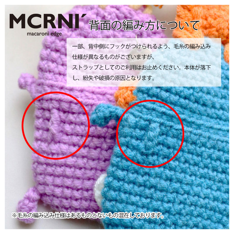 | 注意 | ※ハンドメイドのため、個体差があります。 ※一部、背中側にフックがつけられるよう、毛糸の編み込み仕様が異なるものがございますが、ストラップとしてのご利用はお止めください。本体が落下し、紛失や破損の原因となります。 |